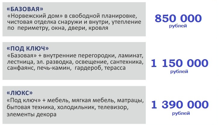 "базовая" 850 000 руб, "под ключ" 1 150 000 руб, "люкс" 1 390 000 руб.